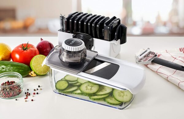 - Compact and practical- our vegetable mandoline slicer can be fully disassembled with ease and the included blade box means that worrying about storage and organization is a thing of the past. Plus this kitchen gadget is dishwasher safe and comes with a specialized cleaning tool, making cleaning a breeze!