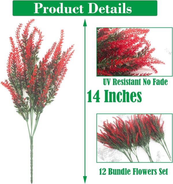 - 【Feature】- Each bouquet has 5 flexible stems and bushy leaves but no annoying powder. Each measures 15″ high x 6.5″ Wide.Comes in 12 bundles artificial lavender in total.