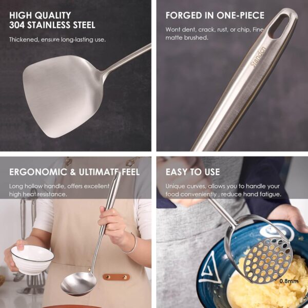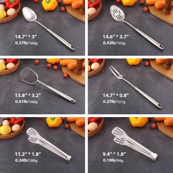 • 【12-Pieces Utensils Set】: 1 potato masher, 2 tongs(9.4in, 11.2in), 1 meat fork, 1 solid serving spoon, 1 slotted serving spoon, 1 spatula, 1 skimmer spoon, 1 slotted spatula tunner, 1 soup ladle, 1 spaghetti spoon, 1 large spoon. Fine matte brushed, silky smooth surface, giving your kitchen the finishing touch