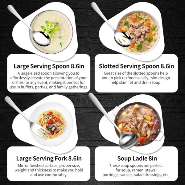 - 12-piece serving utensil set: The package includes 2 large serving spoons, 2 slotted serving spoons, 2 serving forks, 2 serving tongs, 2 appetizer tongs, and 1 soup ladle and 1 pie server. These utensils are made of high-quality stainless steel and are durable, rust-proof, and easy to clean.
