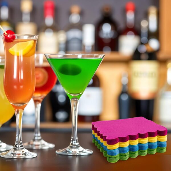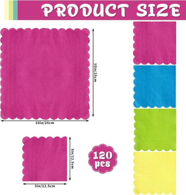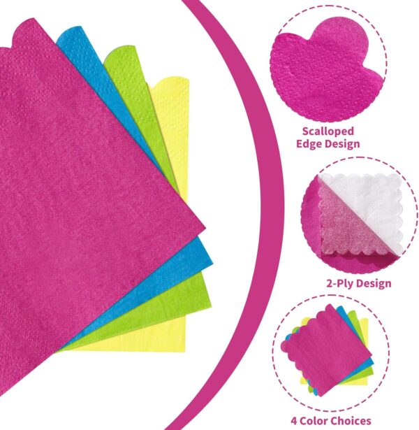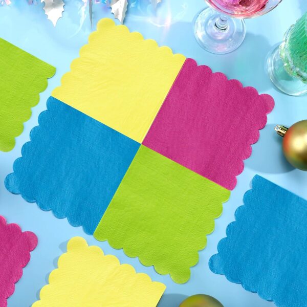 - Gradient Neon Color Design: Disposable cocktail napkins are available in 4 different bright colors, such as red, yellow, purple, green. The classic scalloped edge enhances cute of party napkins, making it a better decoration for party tables.