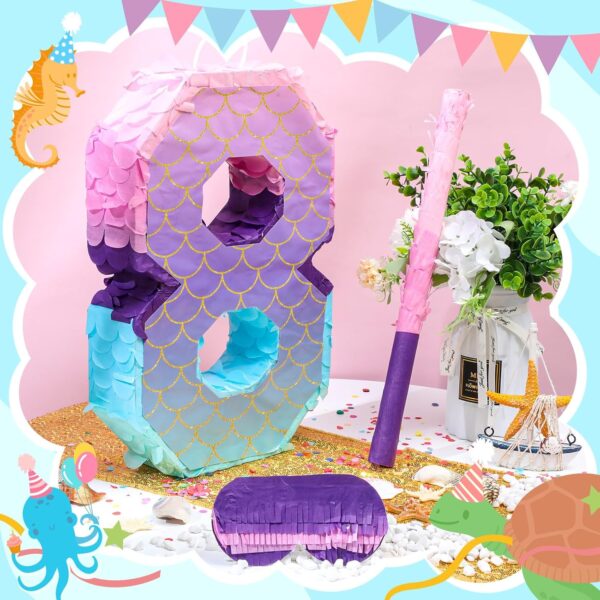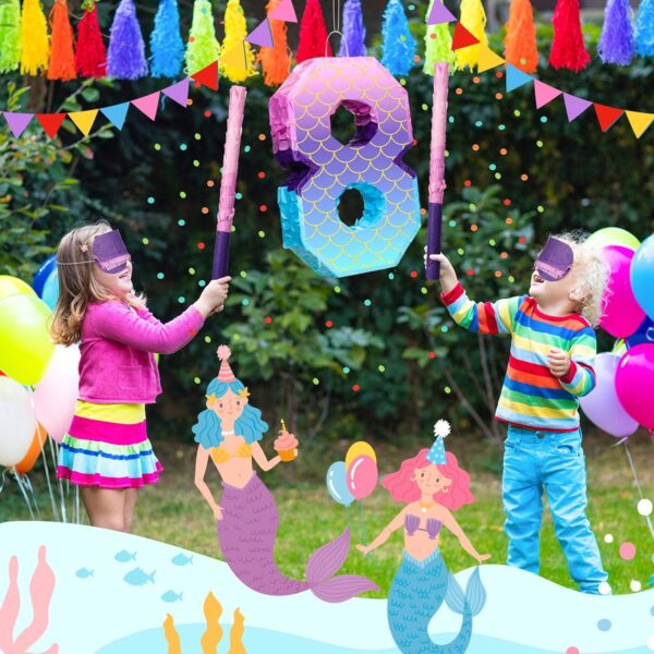 - Comprehensive Package Contents: you will get a comprehensive party decoration; The package includes 1 well crafted large mermaid piñata for birthday party, 1 stick to whack it open, 1 eye mask for adding fun to the game, and a packet of colored paper scraps for decoration or to help find the piñata when it’s high up