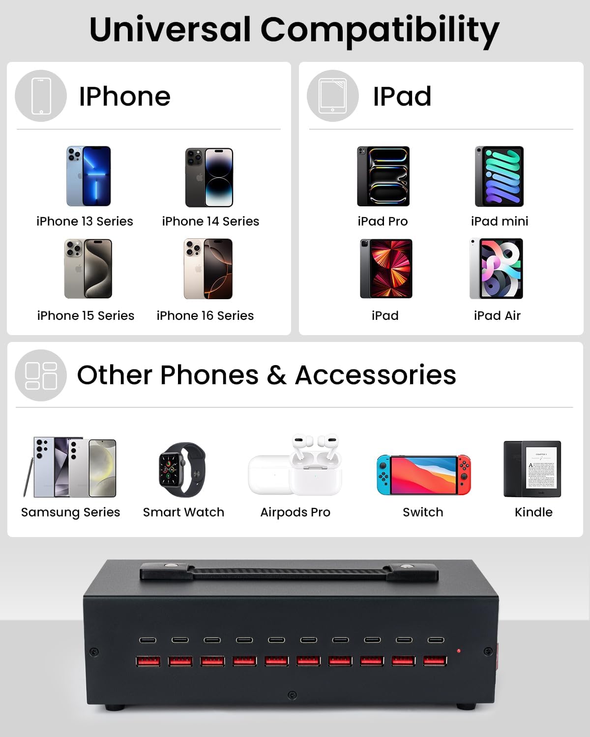 20-Port Charging Hub: 10 USB-C and 10 USB-A ports charge up to 20 devices simultaneously with 3A per port.