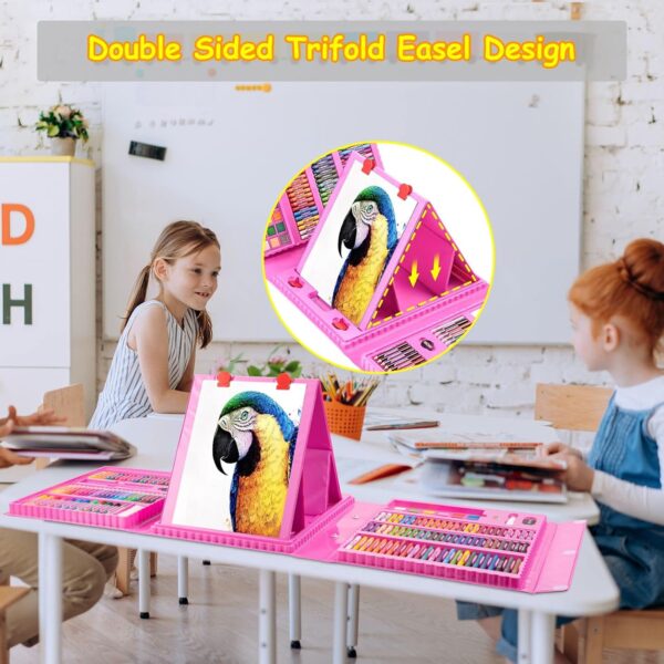 - Double Sided Trifold Easel Design: The built-in folding easel can help you place the paper or the drawing pad at an ideal angle, allowing you to paint anywhere. The painting, drawing & art supplies include all types of coloring and drawing materials for beginners of all ages – especially for kids who love to doodle or want to inspire the joy of painting. Enjoy a creative colorful life