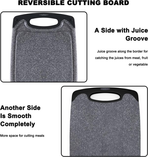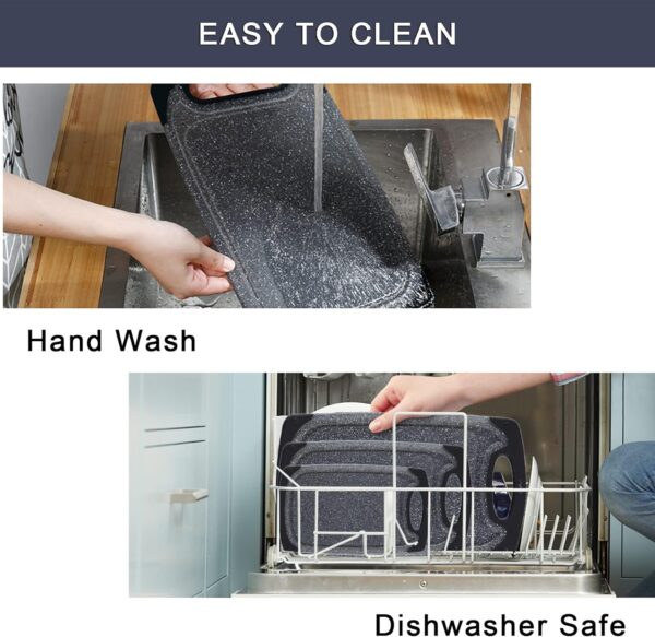 - Knife-Friendly Cutting Boards Dishwasher Safe: They are made from thick, heavy-duty plastic, and marble pattern design reduces scratches on chopping board, durable than ordinary cutting boards. and non-porous design makes cutting boards dishwasher safe. Both surfaces are knives friendly and tough enough to withstand chopping, cutting and dicing.