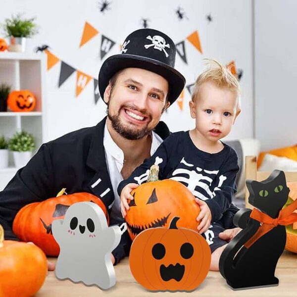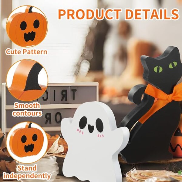 - Festive Halloween Decor: Set of 3 adorable wooden signs featuring a ghost, black cat, and pumpkin for indoor Halloween decorations.