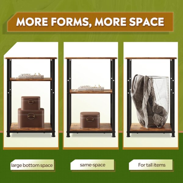 - 【Enough Storage】This rustic brown end table has 3 adjustable shelves, you can choose your favorite style before installation. When using, you can put essentials on each shelf such as coffee, snacks, books. It’s a practical and decorative furniture.