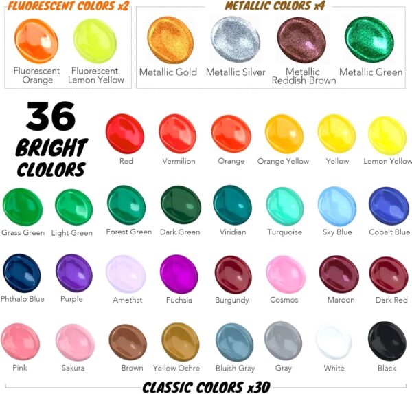 - 【36 Vibrant Colors & Rich Pigment】The Acrylic Paint Set includes 36 – 2 oz bottles of colorful paint, which consists of 30 Classic Colors, 2 Fluorescent Colors and 4 Metallic Colors. The creamy texture of the paint, whether used with a brush or spatula, provides beautiful and brilliant colors for your art, allowing you to use your imagination to create freely. Note: Metallic Colors may be stratified, please shake well before use.