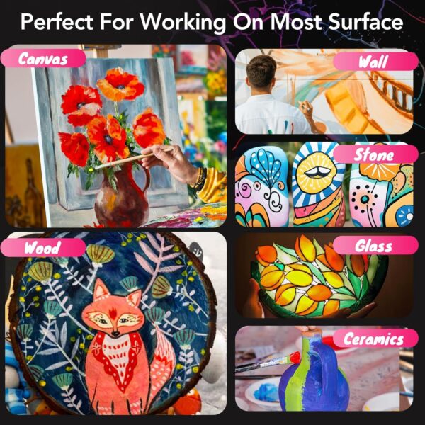 - 【Wide Application】The Paint Set is versatile and works on a variety of surfaces including paper, stretched canvas, wood, glass, plastic, ceramics, decorative wallpaper, terracotta, chalkboard and more. Acrylic paints are easy to mix and can create countless shades from a limited range of colors.