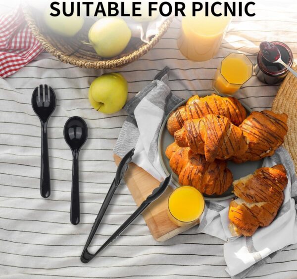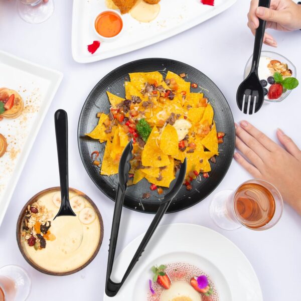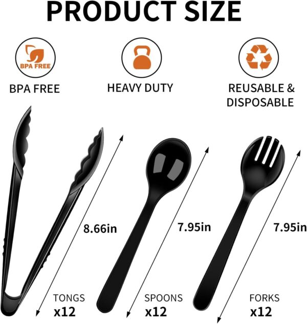 - 【Sufficient Quantity】Our package contains 12 8-inch black plastic spoons, 12 9-inch black plastic dinner tongs, 12 8-inch plastic forks, sufficient quantity and various styles to meet daily needs, perfect for medium to large parties