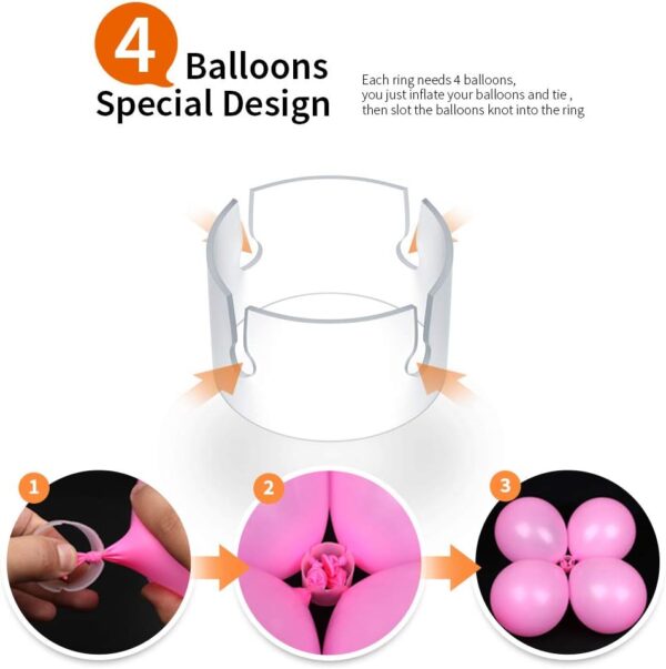 - Special Design Of Balloon Rings: Each ring needs 4 balloons, with its easy-to-use design, you just inflate your balloons and tie, then slot the balloons knot into the ring. Attach it to your desired surface, and voila – instant balloon decor