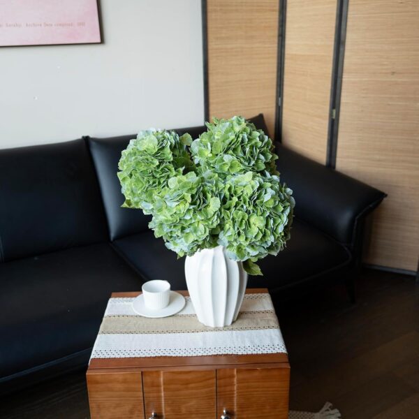 - [VERY REALISTIC APPEARANCE]: The Artificial Hydrangeas look like real, Flowers are made of soft and true touch latex, full and soft petals, No smell, safe for people and pets. More real, bigger and softer than ordinary hydrangea. After spraying water, the petals can condense water drops, can be placed outdoors, and resistant to fading. Note: The vase is NOT included!