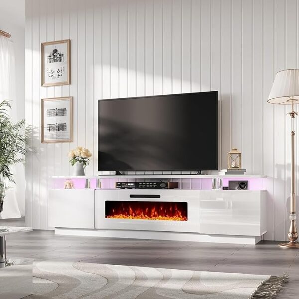 - 80″ Fireplace TV Stand: With 40″ multi-functional electric fireplace features 8 color realistic flame&5 level brightness, temperature control & time setting. LED kit includes 12 changeable colors