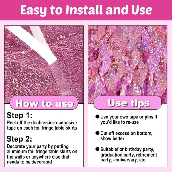 - Package Includes: 6pcs/set metallic fringe table skirts / shiny tassel banner, beautiful and shiny, provide you with great decoration effects, Each pack of table skirt measures 29×108 inches. Each one will be 9 Ft long, 6 pack will cover 54 FT length of tables.
