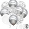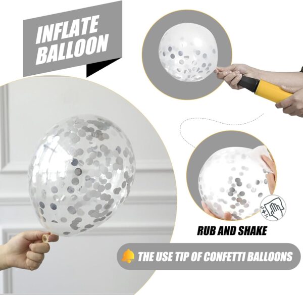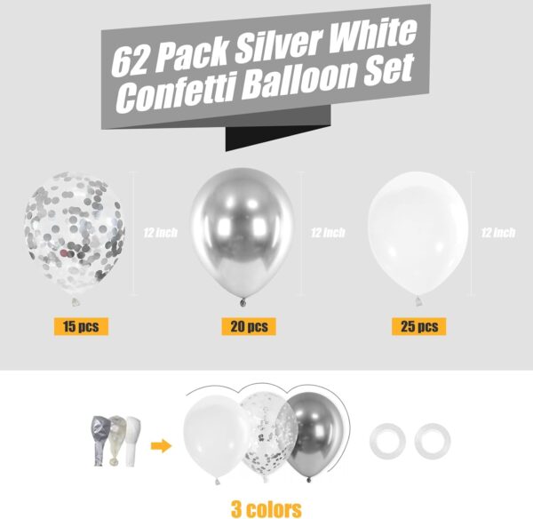 - Valuable pack: OUTEPAI 62pcs colorful confetti balloons kit bilingbling balloon includes 20pcs metallic silver balloons, 25pcs white balloons, 15pcs silver confetti balloons, and 2pcs white ribbons.OUTEPA multicolor silver white confetti balloons can flow to the sky if it is inflated with helium.