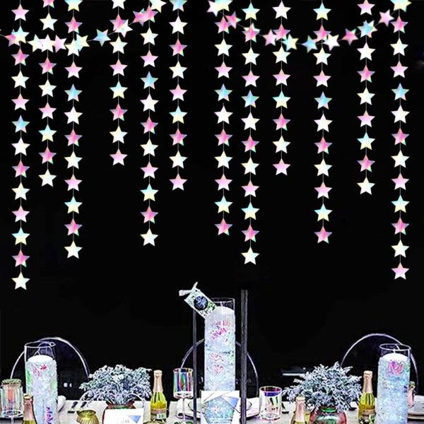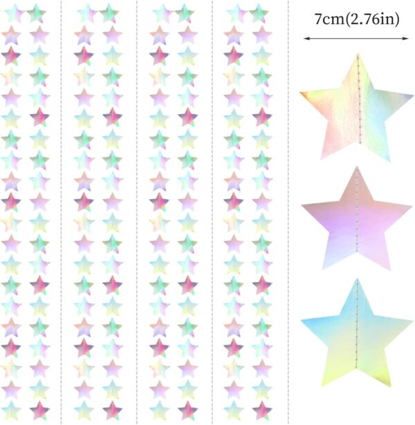 - PACKAGE CONTAINS: This set has 4 iridescent disco-holographic paper star garlands, the length of each strand is 4.7 meters/11.5 feet, the total length is 18.8 meters/62 feet.
