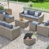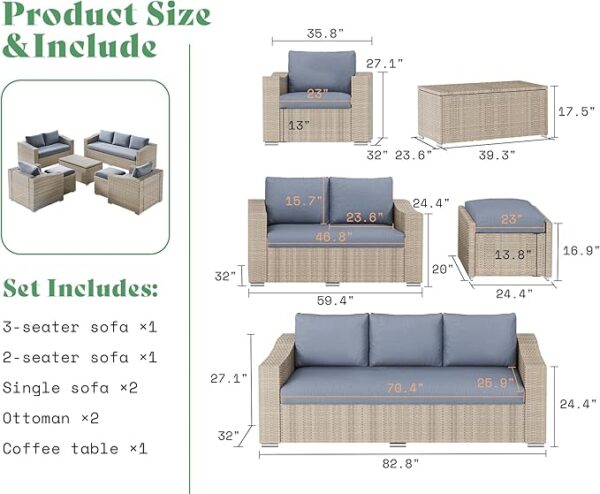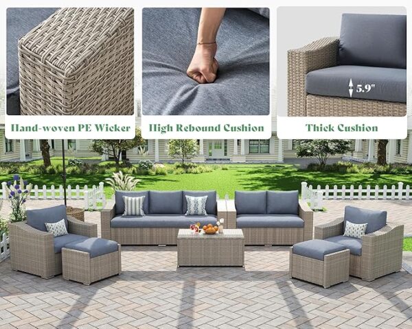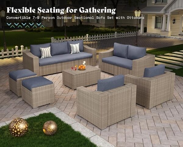 - Multi-Functional Ottomans & Storage: 2 Ottomans serve as footrests, seats, or side tables, with seating adjustable from 7 to 9 persons. The storage coffee table easily stores cushions, blankets, or accessories, organizing your patio furniture or outdoor sofa set.