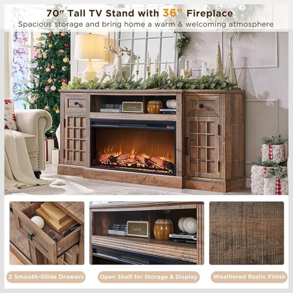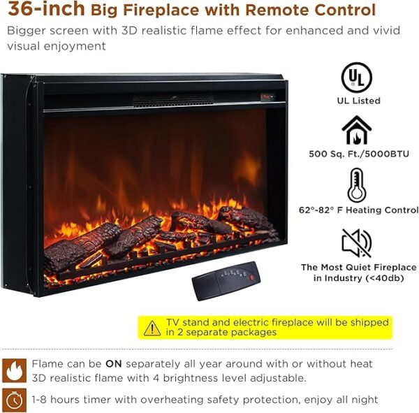 - Stunning Entertainment Center: This striking piece adds a focal point to your living room with its impressive 36-inch electric fireplace, which brings both style and warmth to your space. The realistic 3D log and flame effects create a cozy ambiance that perfectly complements the wooden TV stand. With four adjustable brightness levels, you can easily set the ideal mood. Plus, you can control everything effortlessly from the comfort of your couch using the included remote.