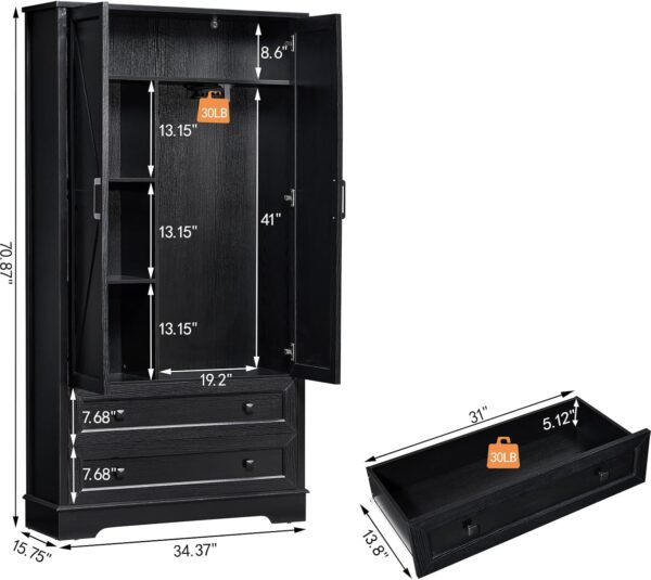 - Ample Storage Capacity: At 34.37″ W x 15.75″ D x 70.87″ H, this black wardrobe includes a spacious upper shelf, a dedicated hanging rod section with three middle shelves, and two large bottom drawers, offering generous storage space for all your essentials.