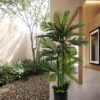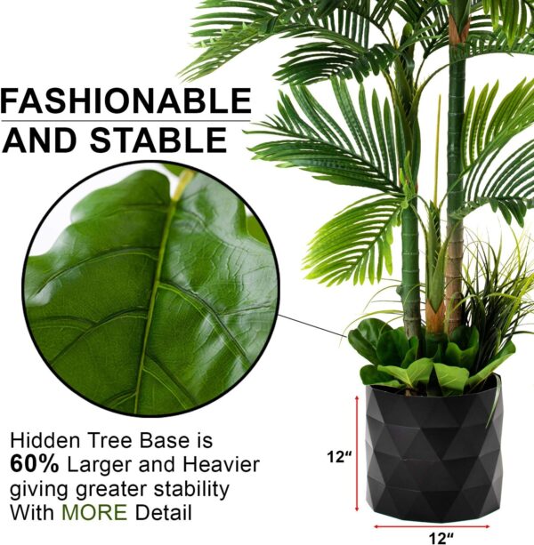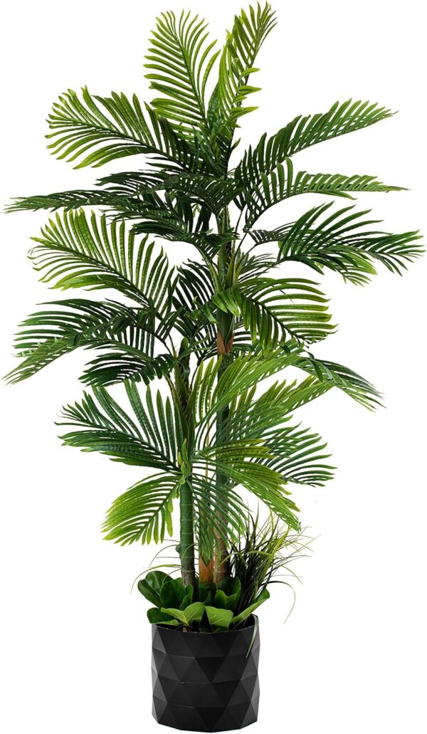 - DELUXE WITH NO MAINTENANCE: This Artificial GOLDEN CANE PALM Tree is a Beautiful Imitation of the Real Thing and Requires NO Maintenance. A Deluxe Addition to your Home Décor the Indoor Silk Leaf Tree is 78 Inches Tall including a base filled with Premium Fiddle Leaf Leaves and Tropical Grasses with a Plant Pot Skirt Surrounding and Hiding the Non Decorative Molded Base – completing the Deluxe Version of the GOLDEN CANE PALM Tree – Enjoy.