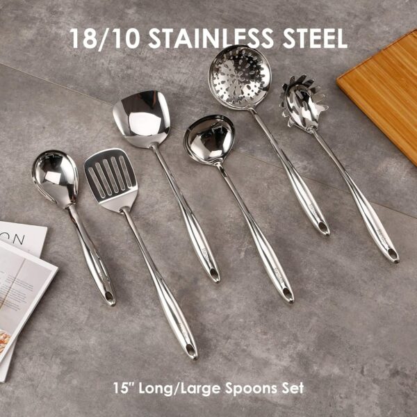 - 15inch lightweight cooking spoons, ergonomic design, precise balance, excellent grip, long handle to provide high heat resistant, make sure the chef’s hands stay cool(The large hollow handles make it slightly lighter than our other utensils)