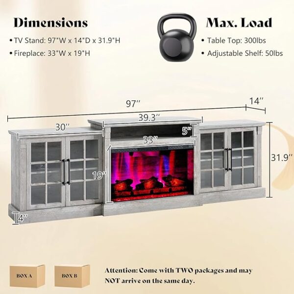 97″ Farmhouse Fireplace TV Stand – Media Console with Storage & Adjustable Shelf (Light Grey)