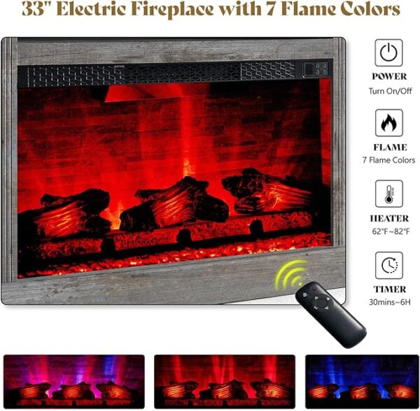 • 33″ Electric Fireplace: 7 flame colors, 5 brightness levels, 62℉-82℉ temperature adjustable and independent flame operation for year-round use. It heats spaces up to 400 sq.ft. Timer (30 min-6H) and overheat protection save energy and ensure your family’s safety