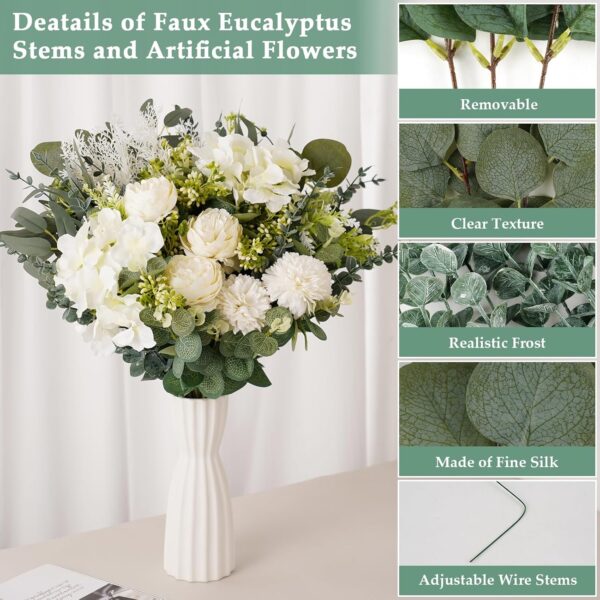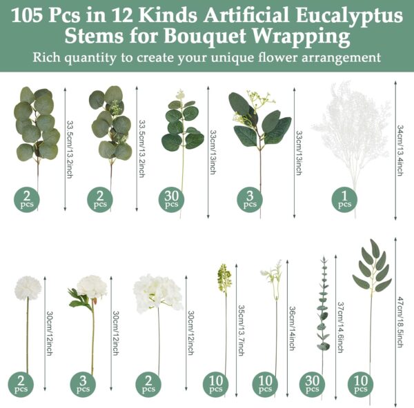- 10 Kinds of Artificial Plants & Flowers : The 105pcs artificial greenery set includes 10 different kinds of plants and flowers, like eucalyptus leaves stems, round eucalyptus leaves with fruits, seeded eucalyptus leaves, silver dollar-pointed eucalyptus leaves, white bracken, chrysanthemum ball, white peony, white hydrangeas, green white berry, faux flowers, blue eucalyptus stems and willow leaves.