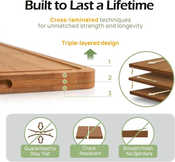 - ๐๐ญ๐ฎ๐ซ๐๐ฒ ๐๐ฎ๐ญ๐ญ๐ข๐ง๐ ๐๐จ๐๐ซ๐๐ฌ – Experience unparalleled durability with our cutting board set, which uses a cross-laminated technique. Each layer of bamboo is precisely interlocked to create a robust structure that resists warping and cracking.