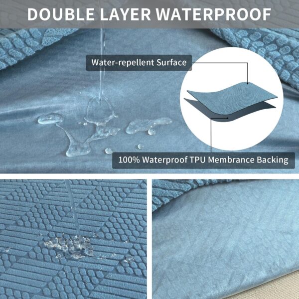 - DOUBLE WATERPROOF: The surface is treated with a water-repellent finish, while the underside is reinforced with a TPU waterproof backing. This combination effectively prevents liquid penetration, keeping your sofa safe from accidental spills, stains, and damage. The added protection ensures your sofa stays looking new longer, providing peace of mind for homes with children and pets. Fits cushions 60-70 inches long, 20-27.5 inches wide, and 2-9 inches thick.
