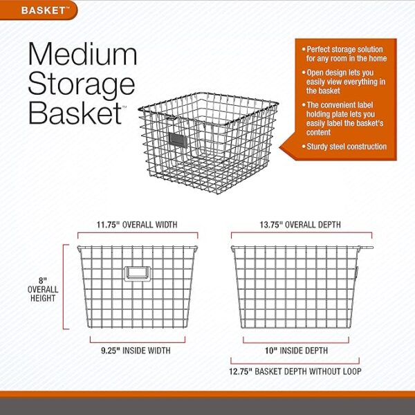 - STORE A VARIETY OF ITEMS: Sturdy steel with smooth welds makes this basket appropriate for a variety of items. Slide a basket full of scarves or hats onto your front closet’s shelf, keep bath accessories nearby with open storage, or tidy up your pantry by storing all your snacks inside. The durable construction and stylish design make this basket appropriate for storage in any room—from the kitchen to the garage.