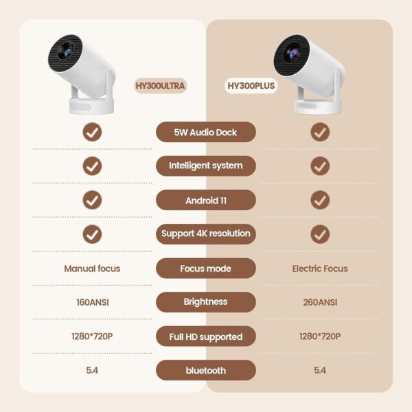 Upgraded Smart Projector: The HY300 Ultra Mini Projector, an enhanced version of the HY300PRO, runs on Android TV 11.0 with Mali-G31 GPU and WiFi 6 support. It features motorized focus, 160 ANSI lumens brightness, Bluetooth 5.4, and access to Netflix, Prime Video, YouTube, and over 500,000 streaming resources.