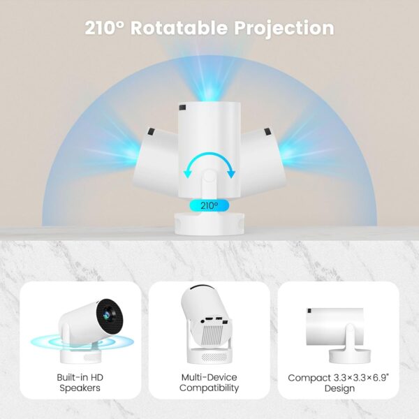 Flexible Projection Design: With a 210° swivel bracket, this projector allows projection on walls, ceilings, and floors. Its short-focus lens delivers a 100-inch screen from just 2m away, making it perfect for home theaters, business meetings, or online learning while maximizing space.