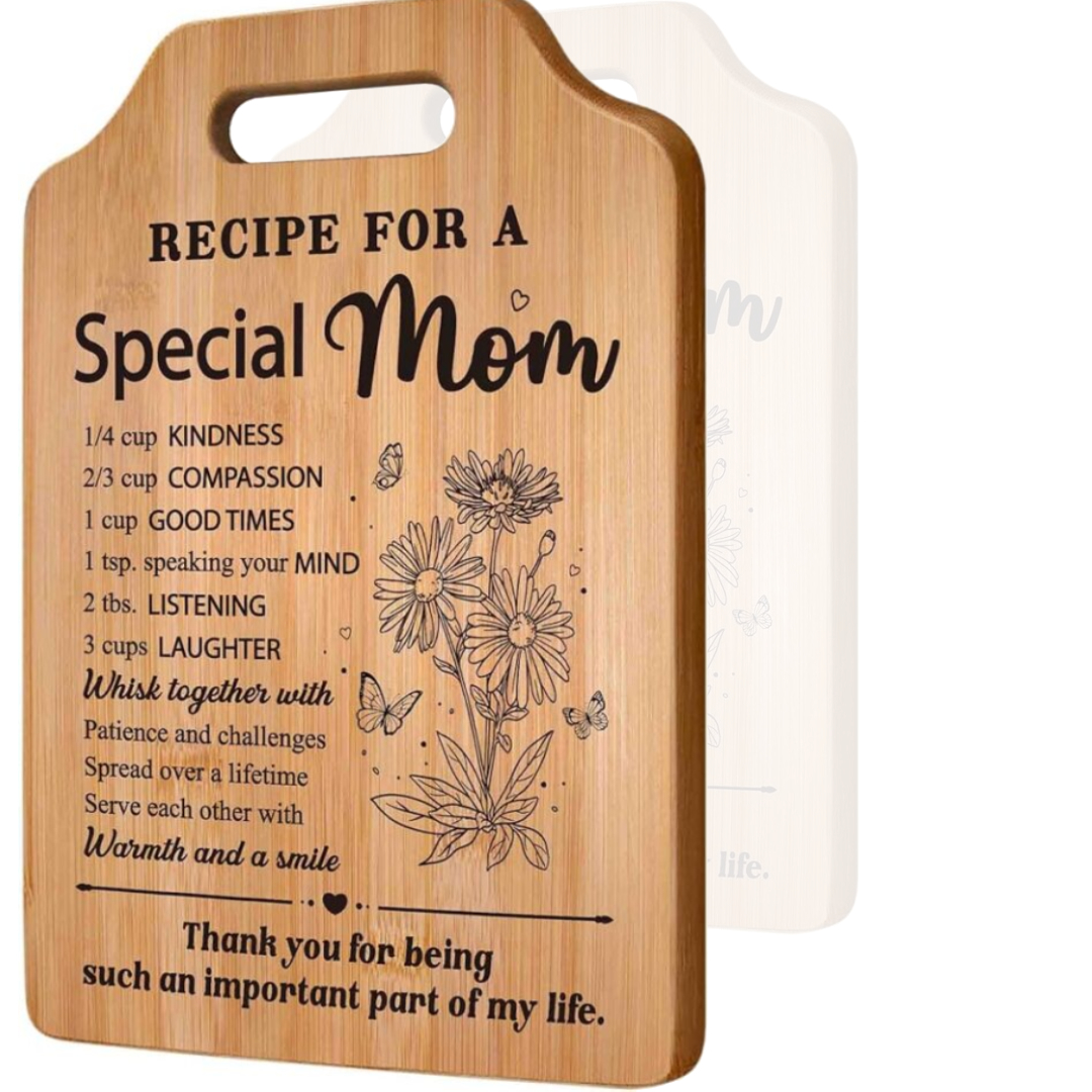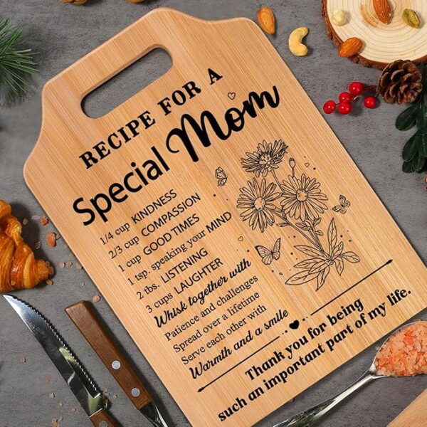 Heartfelt Mother’s Day Sentiment: Celebrate your mom with a unique “Recipe for a Special Mom” poem engraved on a decorative cutting board, designed to make her feel loved every time she enters the kitchen.