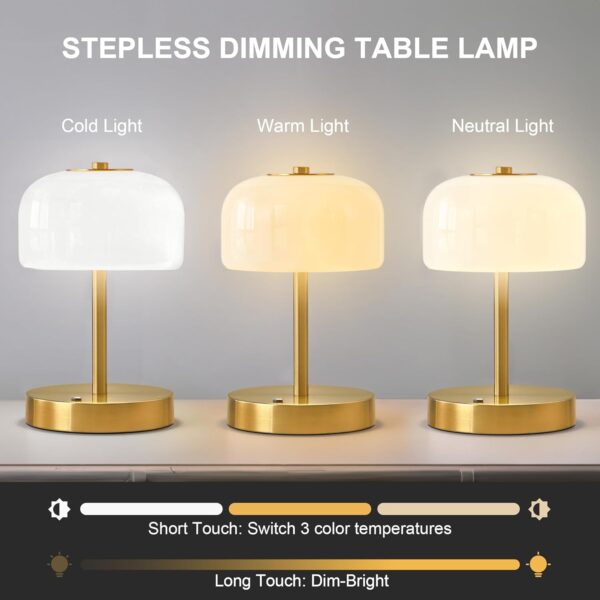 - Touch Switch and Stepless Dimming Table Lamp: It has 3 color temperatures( warm light, neutral light, white light). Tap to change color temperature, and hold to change infinitely brightness. Whether you need a soft, ambient light for relaxing evenings or a brighter setting for reading or working, this wireless table lamp adapts to your needs at the touch of a button