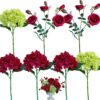 - Value Package – silk festive arrangement features three red hydrangeas, two green hydrangeas, two red multi-bloom roses (each with three flowers and three buds), A captivating blend of colors and textures, perfect for the holiday season!