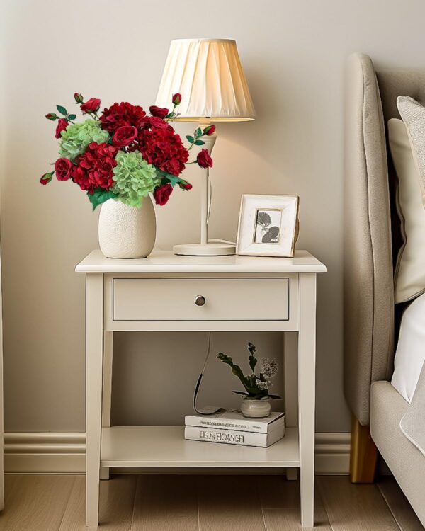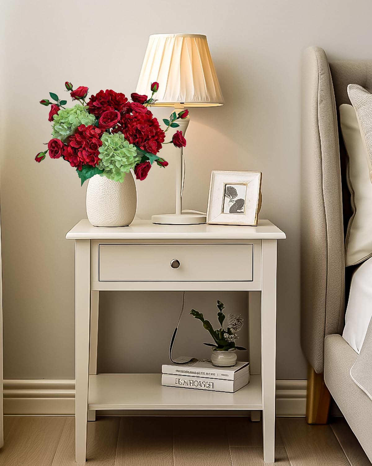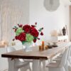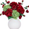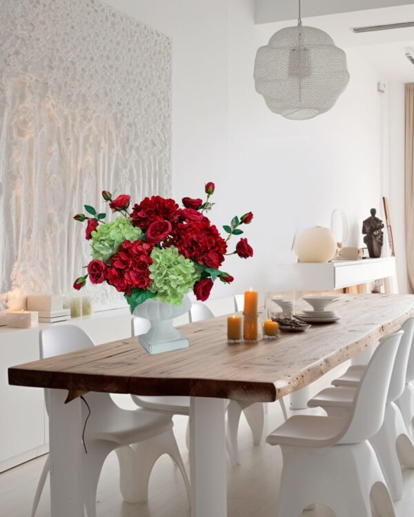 - Professional Floral Arrangement – silk flower bouquet of red and green hydrangeas, red spray roses, brings a warm, festive touch. The vibrant reds and lush greens evoke a cozy, seasonal charm, perfect for winter or holiday celebrations.