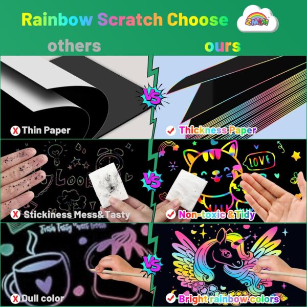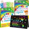 - Magic Rainbow Scratch Books: Include 20 spiral-bound pages & 4 styluses & 4 drawing stencils in scratch paper sets. The underlying color is bright, which is a great contrast to the black scratch-away material. Large art paper create a full size creation and your favorite patterns freely
