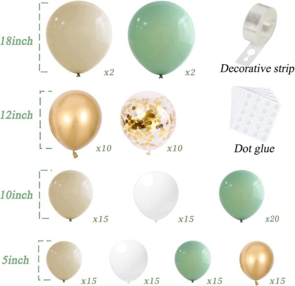 - Sage Green Balloons: This sage green balloon arch kit including: 134pcs, there has 18inch,12inch,10inch and 5inch size balloons, there has: 37pcs sage green balloons, 32pcs sand white balloons, 30pcs matte white balloons, 25pcs metallic gold balloons, 10pcs gold confetti balloons. The sage white balloon garland accessories kit including: 1pcs strip tape, 5pcs glue points.