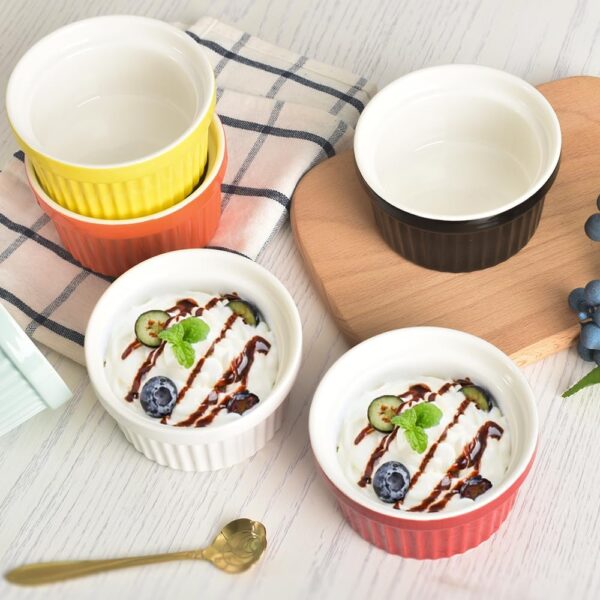 - Not just for baking pies and soufflé, they can also be used for serving snacks and nuts. Also you could use as a ketchup bowl. They are easy to clean. The set are stackable which is easy to store. The ramekins set is microwave / dishwasher / oven safe.