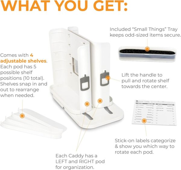 • Magnetic Modular Design: Seamlessly connect multiple caddies side-by-side with the magnetic latch in the base. Expand your storage capacity and create a cohesive organization system within your cabinets.