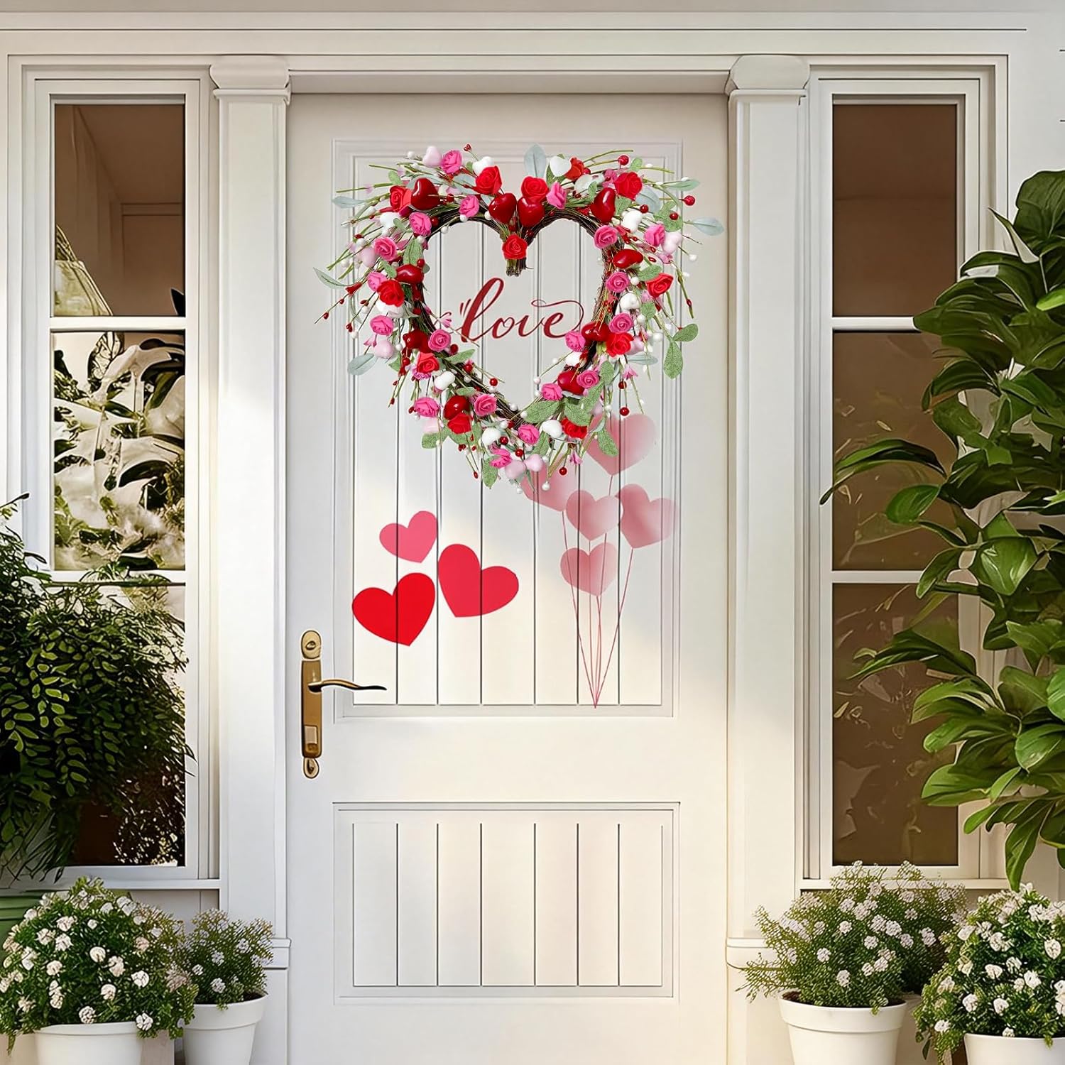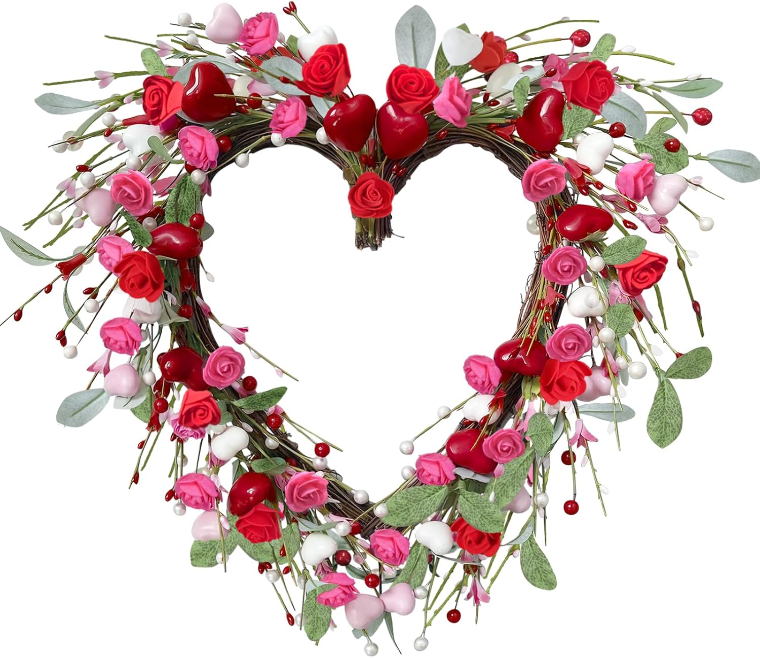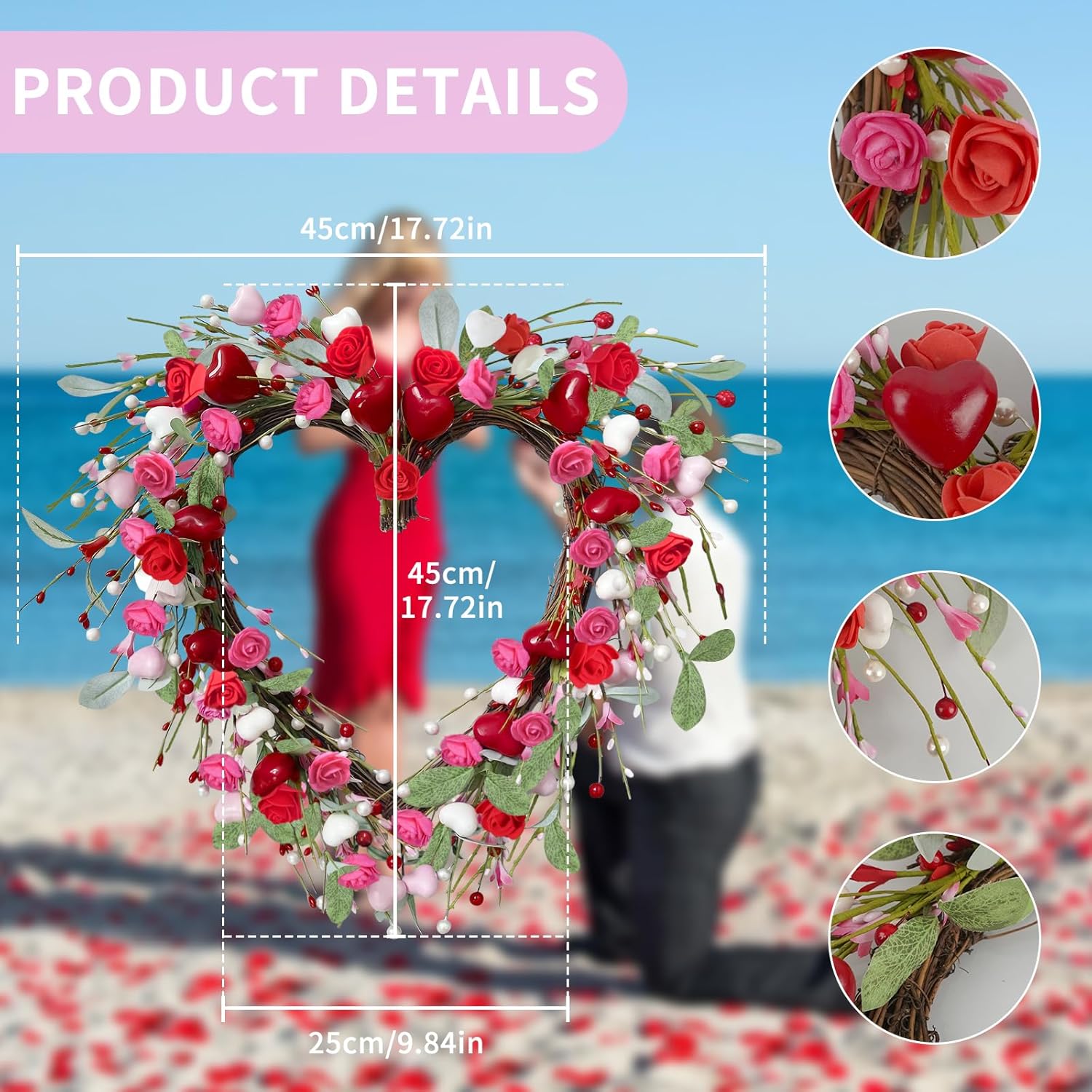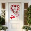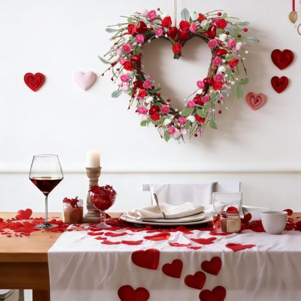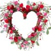 • Valentine’s heart wreath with 9.8″ inner diameter and 17.7″ outer diameter, decorated with roses, hearts, and berries for a romantic touch