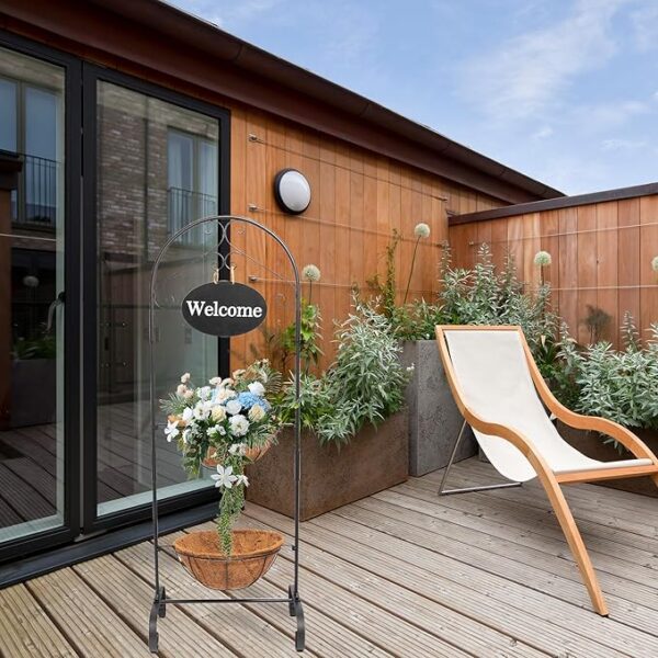 - 【Welcome Planter Stand】This hanging basket planter stand is stylish, Its arched design with swirl A metal decorative welcome sign connects to the top scrolls, invites guests with a warm and inviting ambiance, perfect for creating a hospitable and appealing entrance to your home.